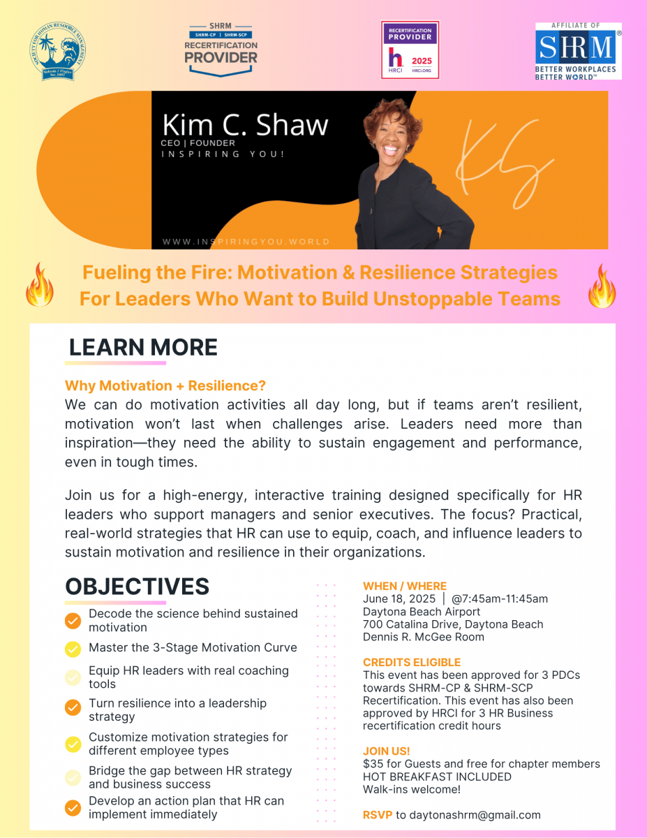 Join us for our Annual Half-Day Leadership Session with Kim Shaw, CEO | CHRO | Leadership & HR Strategist! Hope to see June 18th from 8a - noon at the Daytona International Airport for this incredible learning opportunity.